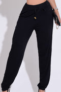 Eleve seu conceito de conforto e estilo com a nossa Calça Preta essencial! Confeccionada em tecido leve e fluido de poliéster com elastano (96% Poliéster, 4% Elastano), esta peça oferece um caimento impecável e uma sensação extremamente agradável ao toque, garantindo liberdade total para seus movimentos, seja no trabalho ou no lazer. O design moderno e funcional conta com bolsos laterais práticos e um cós com elástico e amarração ajustável, que permite um ajuste perfeito e personalizado à sua cintura, adicionando um charme extra ao visual. Essencial para quem busca versatilidade sem abrir mão da elegância no dia a dia.