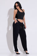 Modelagem: Calça soltinha com bolsos laterais e amarração na cintura