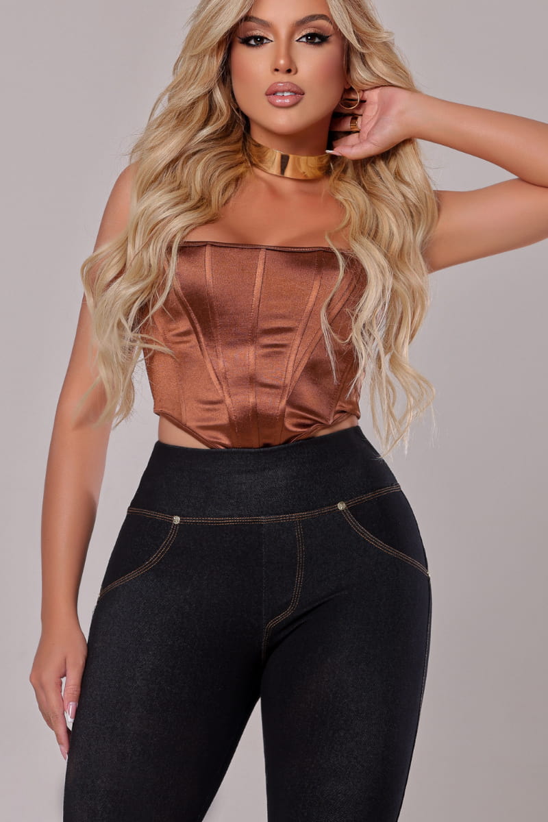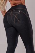 O destaque está na costura dourada, que adiciona um toque de sofisticação e charme. A calça possui um cós alto que garante um ajuste seguro, enquanto o efeito modelador ajuda a definir a silhueta. Feita em tecido Cotton Jeans, oferece resistência e uma sensação agradável ao toque.